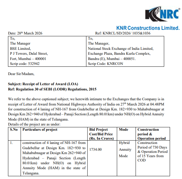 KNR Construction Bagged Order: इंफ्रास्ट्रक्चर सेक्टर की प्रमुख कंपनी KNR Constructions Ltd. को एक बड़ा प्रोजेक्ट हासिल हुआ है, जिससे कंपनी को आने वाले समय में ऑर्डर बुक मजबूत होने की उम्मीद है. कंपनी ने शनिवार, 28 मार्च को जानकारी दी कि उसे नेशनल हाईवे अथॉरिटी ऑफ इंडिया (NHAI) से करीब 1,734 करोड़ रुपये का प्रोजेक्ट मिला है. इस ऑर्डर अपडेट के बाद सोमवार, 30 मार्च को कंपनी के शेयरों में हलचल दिख सकती है.