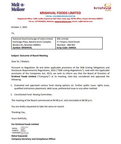 बुधवार, 1 अक्टूबर को बाजार बंद होने के बाद, कृषिवल फूड्स ने स्टॉक एक्सचेंज को दी गई जानकारी में बताया कि उनके बोर्ड ऑफ डायरेक्टर्स ने फंड जुटाने के कई विकल्पों को मंजूरी दी है. इनमें पब्लिक इश्यू, राइट्स इश्यू, क्वालिफाइड इंस्टीट्यूशनल प्लेसमेंट, डेट इश्यू, प्रेफरेंशियल इश्यू या अन्य तरीके शामिल हैं. कंपनी ने यह भी बताया कि बोर्ड ने फंड जुटाने के लिए एक विशेष समिति का गठन किया है. यह समिति फंड जुटाने की प्रक्रिया को सुचारू रूप से चलाने में मदद करेगी.इसके बाद इसके शेयर में रैली देखी जा सकती है.