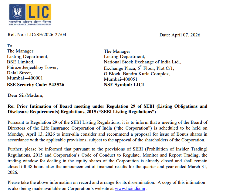 रेगुलेटरी फाइलिंग के मुताबिक, LIC का बोर्ड 13 अप्रैल 2026 को बैठक करेगा, जिसमें बोनस शेयर जारी करने के प्रस्ताव पर विचार किया जाएगा. अगर यह प्रस्ताव मंजूर होता है, तो यह LIC के लिए एक अहम कदम होगा, क्योंकि अब तक कंपनी ने कभी बोनस शेयर जारी नहीं किए हैं. हालांकि, इस प्रस्ताव को लागू करने के लिए शेयरधारकों की मंजूरी भी जरूरी होगी और इसे लागू नियमों के तहत ही आगे बढ़ाया जाएगा.