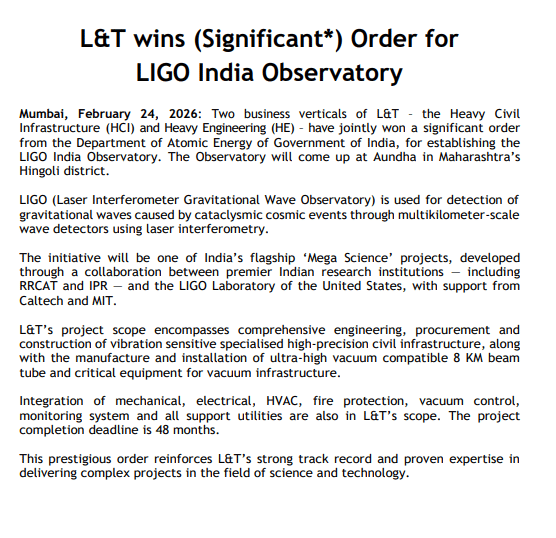 Larsen & Toubro (L&T) को भारत सरकार से LIGO इंडिया ऑब्जर्वेटरी बनाने का बड़ा ठेका मिला है, जिसकी अनुमानित लागत 1,000 रुपये से 2,500 करोड़ रुपये की कैटेगरी में है. महाराष्ट्र में बनने वाली यह हाई-टेक वैज्ञानिक सुविधा भारत को वैश्विक शोध के अग्रिम पंक्ति में ला सकती है.
