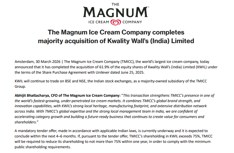 Magnum Acquire Quality Walls Majority Stake: देश के आइसक्रीम बाजार में एक बड़ा कॉर्पोरेट बदलाव सामने आया है, जिसने इस सेक्टर में प्रतिस्पर्धा और रणनीतिक दिशा दोनों को प्रभावित करने की संभावना पैदा कर दी है. मैग्नम आइसक्रीम नीदरलैंड्स ने क्वालिटी वॉल्स (इंडिया) लिमिटेड (KWIL) में 61.9 फीसदी की हिस्सेदारी का अधिग्रहण सफलतापूर्वक पूरा कर लिया है. इस डील के बाद कंपनी के स्वामित्व ढांचे में अहम बदलाव हुआ है और मैग्नम अब कंपनी का नया प्रमोटर बन गया है.