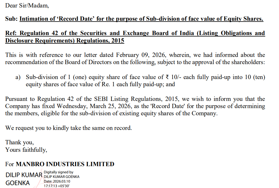 कंपनी से जुड़ी एक और अहम खबर यह है कि मैनब्रो इंडस्ट्रीज लिमिटेड अपना नाम बदल रही है. अब कंपनी का नया नाम KD Green Industries Limited होगा. कंपनी के बोर्ड ऑफ डायरेक्टर्स ने इस प्रस्ताव को फरवरी 2026 में मंजूरी दी थी. इसके बाद इसे शेयरधारकों की मंजूरी के लिए रखा गया. 9 मार्च को आयोजित कंपनी की असाधारण आम बैठक (EGM) में शेयरहोल्डर्स ने भी इस प्रस्ताव को मंजूरी दे दी, जिसके बाद नाम बदलने की प्रक्रिया आगे बढ़ गई है.
