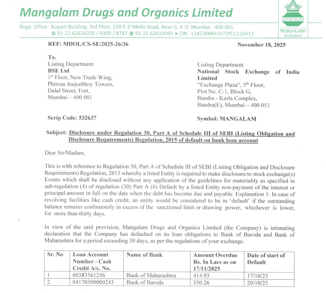 मंगलम ड्रग्स एंड ऑर्गेनिक्स के शेयरों में पिछले दो दिनों से भारी गिरावट देखी जा रही है. कंपनी द्वारा बैंक ऑफ बड़ौदा और बैंक ऑफ महाराष्ट्र के लोन भुगतान में डिफॉल्ट करने की जानकारी सामने आते ही शेयर 52-सप्ताह के निचले स्तर पर पहुंच गए. अमेरिकी सहायता बंद होने से ऑर्डर घटे और वित्तीय दबाव बढ़ा, जिससे निवेशकों की चिंता तेज हुई.