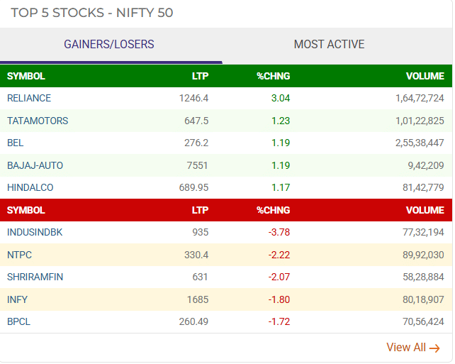 Sensex में शुक्रवार को रिलायंस इंडस्ट्रीज 3.18 फीसदी तेजी के साथ टॉप गेनर स्टॉक रहा. वहीं, जोमैटो 3.82 फीसदी गिरावट के साथ टॉप लूजर रहा. निफ्टी में भी रिलायंस इंडस्ट्रीज का शेयर टॉप गेनर रहा. जबकि, इंडसइंड बैंक 3.78 फीसदी गिरावट के साथ टॉप लूजर रहा.