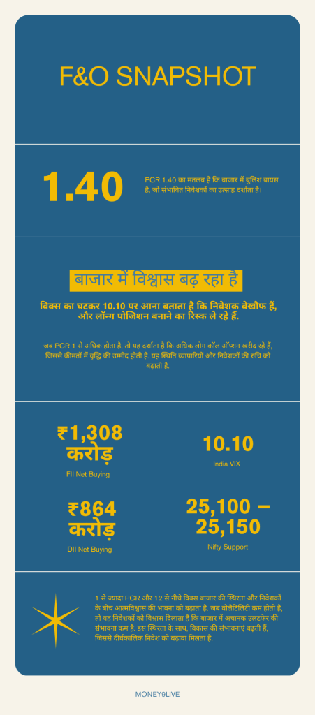 डेरिवेटिव फ्रंट पर, 25,200 स्ट्राइक पर भारी Put OI (1.50 करोड़ कॉन्ट्रैक्ट) देखने को मिला है, जो मजबूत सपोर्ट का संकेत है, जबकि 25,500 स्ट्राइक पर 1.21 करोड़ Call OI रेजिस्टेंस बना हुआ है. वहीं, Put-Call Ratio बढ़कर 1.40 तक पहुंच गया है, जो मार्केट में बुलिश सेंटिमेंट को मजबूत करती है. इसके अलावा India VIX भी 0.17% घटकर लो लेवल्स पर बना है हुआ है. इसका मतलब है कि वोलैटिलिटी फिलहाल पूरी तरह कंट्रोल में है, और निवेशकों में किसी तरह का कोई डर नहीं हैं.