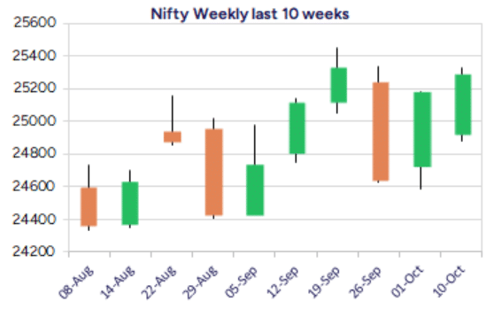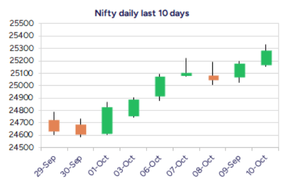 SAMCO Securities के डेरिवेटिव रिसर्च एनालिस्ट धूपेश धमेजा बताते हैं कि निफ्टी ने पिछले दो वीक से लगातार हायर हाई बनाए हैं, जो मजबूत बुलिश मोमेंटम का संकेत है. 25,285 के आसपास क्लोजिंग के बाद इंडेक्स अपने ब्रेकआउट जाेन के ऊपर टिक चुका है. टेक्निकली निफ्टी अपने 10-DEMA और 20-DEMA से ऊपर बना हुआ है, जिससे 25,100–25,150 का जोन स्ट्रॉग डिमांड पॉकेट बन गया है.