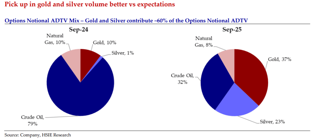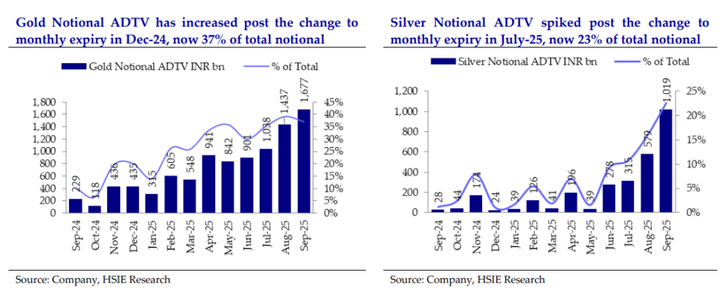 MCX ने हाल ही में अपने सोना-चांदी ऑप्शन कॉन्ट्रैक्ट्स में बदलाव किया है. अब इनमें मंथली एक्सपायरी और छोटे साइज हैं, जिससे रिटेल भागीदारी बढ़ी है. सितंबर 2025 में गोल्ड का नोशनल एवरेज डेली ट्रेडिंग वॉल्यूम (ADTV) 1.7 लाख करोड़ और प्रीमियम 8.3 अरब रुपये पहुंच गया है. वहीं, सिल्वर का नॉशनल ADTV 1.02 लाख करोड़ रुपये और प्रीमियम 5.7 अरब रुपये रहा. HDFC का अनुमान है कि FY27 तक बुलियन प्रीमियम ADTV 25 अरब रुपये तक पहुंच सकता है, जो कुल प्रीमियम का लगभग 40% होगा.