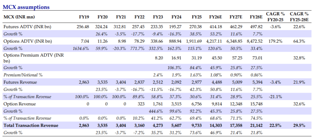 ब्रोकरेज के अनुमान के मुताबिक Q2FY26 में MCX का रेवेन्यू लगभग 375 करोड़ रुपये रहेगा, जो QoQ 0.4% और YoY 31% की वृद्धि दर्शाता है. हालांकि, PAT थोड़ा घटकर 201 करोड़ रहने का अनुमान है, लेकिन अक्टूबर से वॉल्यूम में फिर उछाल दिख रहा है. वहीं, इस दौरान कंपनी का EBITDA मार्जिन लगभग 65% पर स्थिर रहने की उम्मीद है. HDFC Securities के मुताबिक सोना-चांदी के ऑप्शंस में तेजी, नए प्रोडक्ट लॉन्च और रेगुलेटरी टेलविंड्स से MCX की ग्रोथ कहानी लंबी दौड़ की है. मौजूदा स्तरों से स्टॉक में अभी 10 से 15% और तेजी की गुंजाइश है.