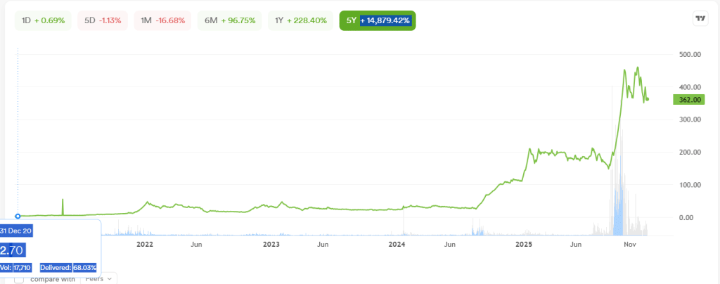 पांच साल पहले जहां यह शेयर सिर्फ 2.70 रुपये पर ट्रेड कर रहा था, वहीं अब यह करीब 362 रुपये तक पहुंच चुका है. यानी करीब 14,879.42 फीसदी का जबरदस्त उछाल. दिखाया है. इतने कम समय में शेयर की कीमत में आई इस बड़ी तेजी ने निवेशकों की दौलत कई गुना बढ़ा दी है. अगर किसी निवेशक ने पांच साल पहले इस शेयर में 1 लाख रुपये लगाए होते और निवेश बनाए रखा होता, तो आज उसकी वैल्यू करीब 1.34 करोड़ रुपये हो चुकी होती.