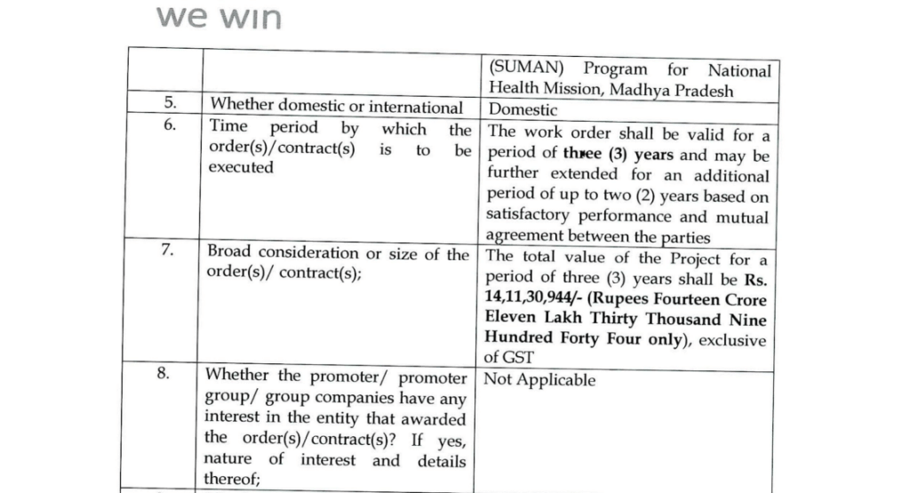 कंपनी ने एक्सचेंज फाइलिंग के जरिए जानकारी दी कि उसे मध्य प्रदेश के नेशनल हेल्थ मिशन के तहत सुरक्षित मातृत्व आश्वासन (SUMAN) प्रोग्राम में काम करने का ऑर्डर मिला है. इस प्रोजेक्ट में कंपनी को Integrated Command and Control Centres और जिला हेल्पडेस्क की स्थापना, संचालन और प्रबंधन की जिम्मेदारी दी गई है.