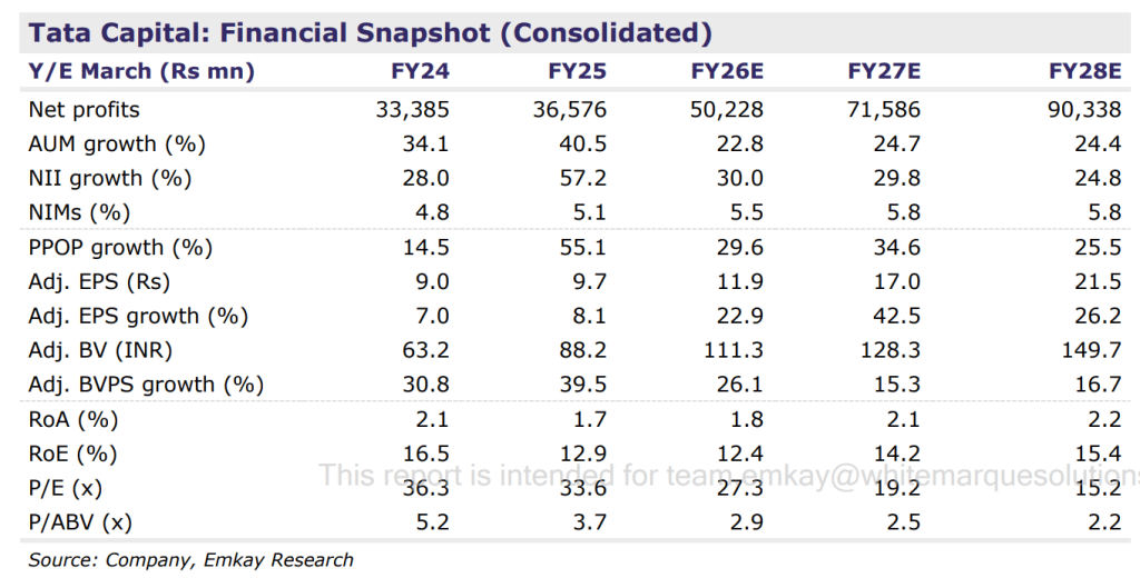 Emkay Global का मानना है कि Tata Capital का बिजनेस मॉडल स्थिर और डाइवर्सिफाइड है, जो इसे लंबे समय के लिए भरोसेमंद निवेश बनाता है. फर्म ने कंपनी के लिए लगभग 24 फीसदी AUM CAGR और 30 फीसदी EPS CAGR (2025–2028) का अनुमान लगाया है. हालांकि ब्रोकरेज का कहना है कि कंपनी की रिटर्न प्रोफाइल अभी भी मिड-रेंज में रहेगी यानी FY28 तक RoA ~2.2 फीसदी और RoE ~15.4 फीसदी तक पहुंच सकती है.