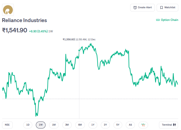 रिलायंस इंडस्ट्रीज के शेयर बुधवार दोपहर 12:50 बजे करीब 1,541.90 रुपये के स्तर पर कारोबार कर रहे थे. इसका 52 हफ्तों का हाई 1,580.90 रुपये और लो 1,115.55 रुपये रहा है.