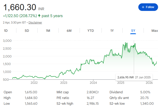 अभी के हिसाब से कंपनी करीब 5 प्रतिशत का डिविडेंड यील्ड देती है. FY25 में कंपनी ने 83 रुपये प्रति शेयर का डिविडेंड दिया था, जो निवेशकों के लिए अच्छा माना जाता है. कंपनी की कमाई लगातार बढ़ रही है. FY25 में कंपनी की आय बढ़कर 727 करोड़ रुपये हो गई. मुनाफा भी अच्छा बढ़ा है और कंपनी की मार्जिन करीब 29 प्रतिशत है.