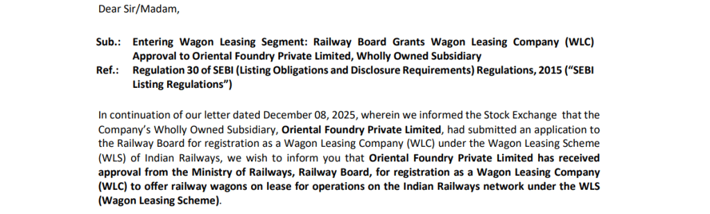 रेल इंफ्रास्ट्रक्चर सेक्टर की कंपनी Oriental Rail Infrastructure Limited ने अपने कारोबार को नई दिशा देने की बड़ी पहल की है. कंपनी की पूर्ण स्वामित्व वाली सब्सिडियरी Oriental Foundry Private Limited को रेलवे बोर्ड से वैगन लीजिंग कंपनी के रूप में काम करने की ऑफिशियली मंजूरी मिल गई है. यह मंजूरी कंपनी को इंडियन रेलवे की वैगन लीजिंग स्कीम के तहत देशभर में रेल वैगन लीज पर देने की इजाजत देती है. शेयर अपने 52 हफ्ते के हाई से करीब 52 प्रतिशत डिस्काउंट पर कामकाज कर रहा है.