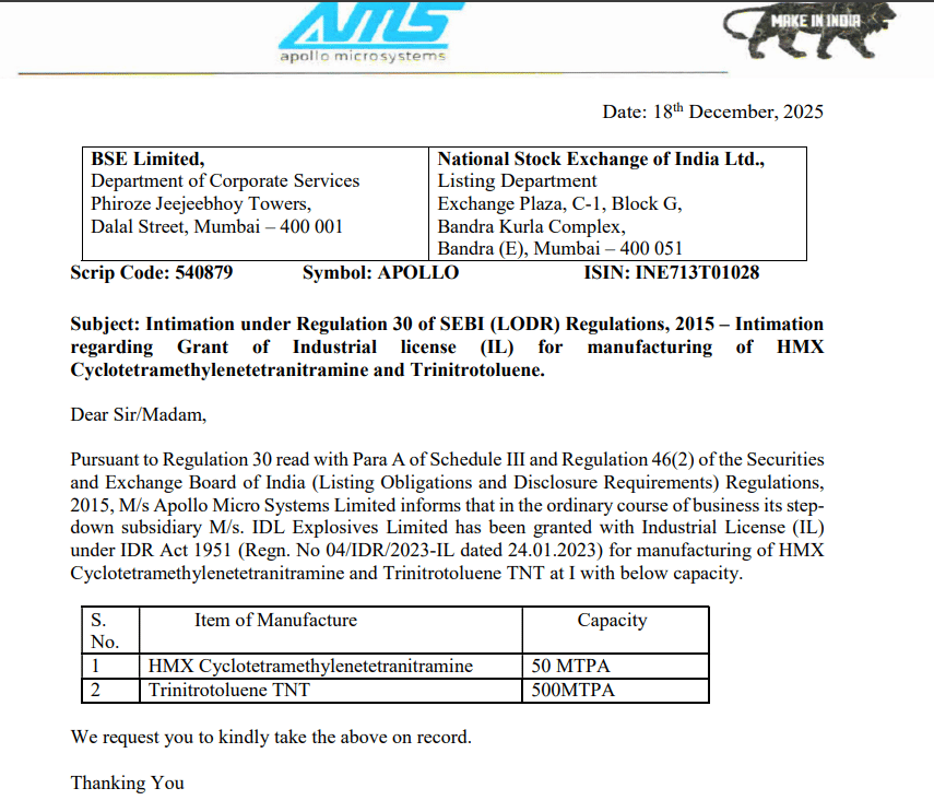 Apollo Micro Systems ने शेयर बाजार को जानकारी दी कि उसकी स्टेप-डाउन सब्सिडियरी IDL Explosives Limited को डिफेंस से जुड़े अहम विस्फोटक बनाने के लिए इंडस्ट्रियल लाइसेंस मिल गया है. यह लाइसेंस Industries (Development and Regulation) Act, 1951 के तहत दिया गया है.