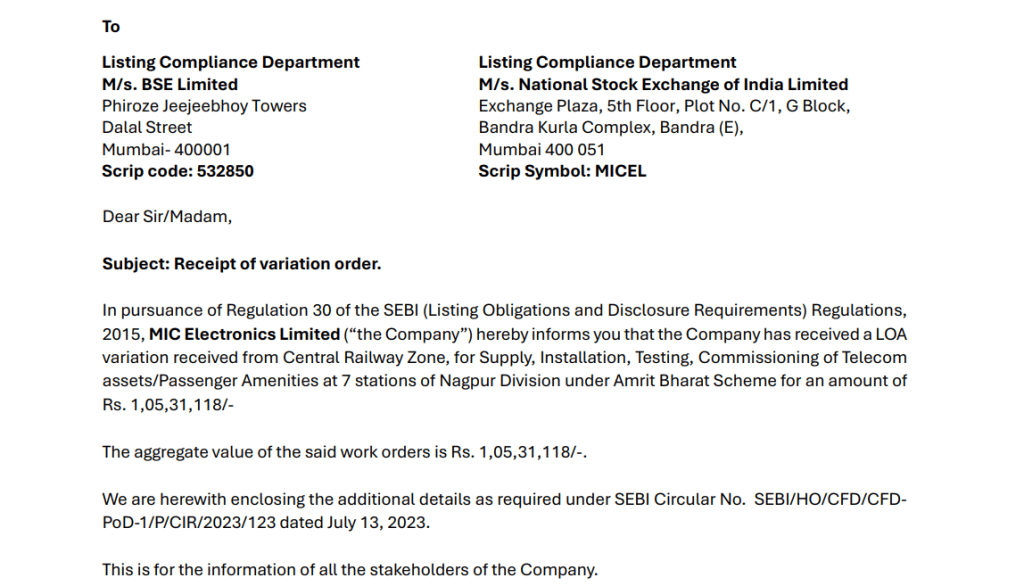 कंपनी को सेंट्रल रेलवे जोन के नागपुर डिवीजन से एक अहम घरेलू ऑर्डर मिला है. यह काम अमृत भारत योजना के तहत किया जाएगा. इस ऑर्डर की कुल वैल्यू करीब 1,5,31,118 रुपये है. इसके तहत कंपनी को सात रेलवे स्टेशनों पर टेलीकॉम से जुड़ी जरूरी सुविधाएं और पैसेंजर अमेनिटीज की सप्लाई इंस्टॉलेशन, टेस्टिंग और कमीशनिंग का काम करना है. यह ऑर्डर टेंडर प्रक्रिया के जरिए मिला है और इससे कंपनी की ऑर्डर बुक को मजबूती मिलेगी. रेलवे के आधुनिकीकरण में MIC Electronics की भूमिका को भी यह ऑर्डर और मजबूत करता है.