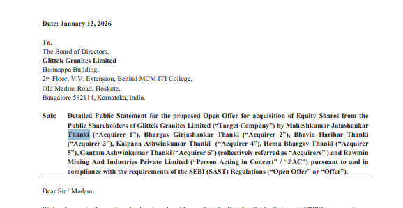 कंपनी में हिस्सेदारी खरीदने के लिए छह व्यक्तिगत निवेशकों के समूह ने अनिवार्य ओपन ऑफर लाने का ऐलान किया है. इस समूह की अगुवाई महेशकुमार जटाशंकर थानकी कर रहे हैं और इसमें Rawmin Mining and Industries Private Limited को सपोर्टिंग पार्टी यानी पीएसी के तौर पर शामिल किया गया है.