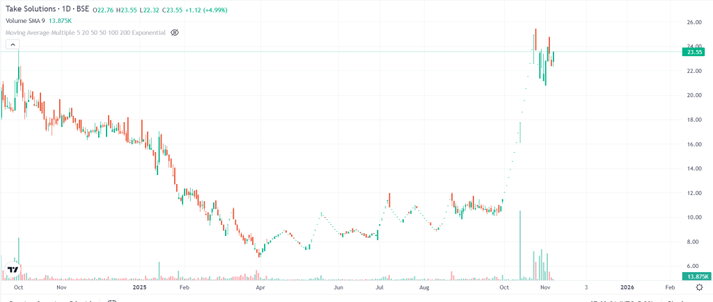 शेयर बाजार में सोमवार को TAKE Solutions Ltd के शेयरों ने शानदार उछाल दिखाया. कंपनी के शेयर 5 फीसदी बढ़कर 23.74 रुपये प्रति शेयर पर पहुंच गए, जबकि पिछले सत्र में यह 22.61 रुपये पर बंद हुए थे. इस उछाल के साथ शेयर ने 5 फीसदी अपर सर्किट छू लिया. स्टॉक का 52 हफ्तों का हाई 25.05 रुपये और न्यूनतम स्तर 6.51 रुपये है. कंपनी के शेयरों में 3.31 लाख से ज्यादा का वॉल्यूम दर्ज हुआ. पिछले हफ्ते इस शेयर ने अपना 52-वीक हाई बनाया है. पिछले 3 महीने में इसने 163 फीसदी का रिटर्न दिया है.