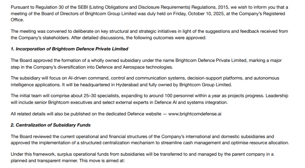 अब कंपनी अपनी नई इकाई Brightcom Defence के माध्यम से AI-पावर्ड नेशनल सिक्योरिटी सिस्टम्स, एयरोस्पेस इंटेलिजेंस और स्वायत्त प्रणालियों (Autonomous Systems) के क्षेत्र में प्रवेश कर रही है.