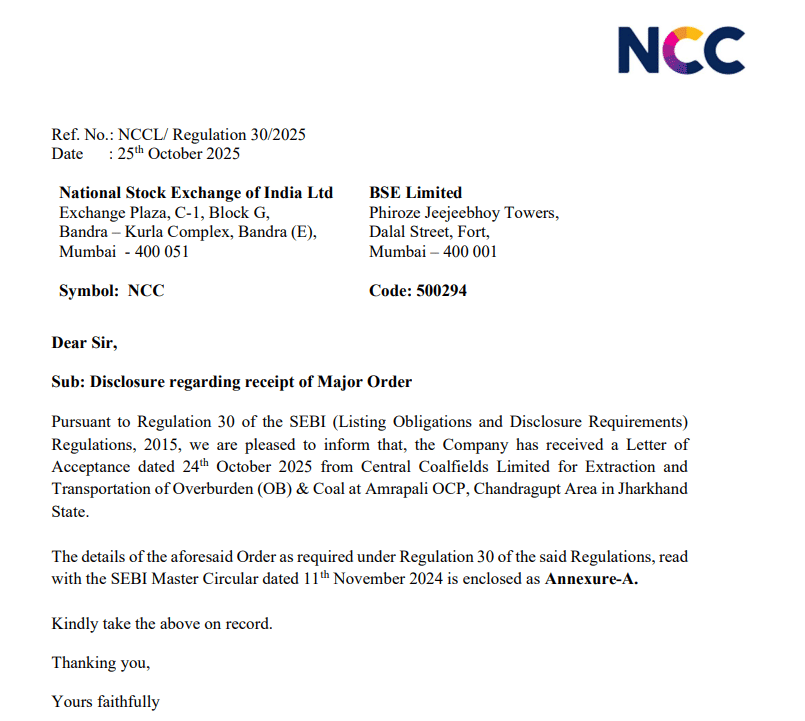 NCC Ltd Bagged Order From CCL: NCC Ltd ने झारखंड में Coal India की सहायक कंपनी Central Coalfields Ltd (CCL) से लगभग 6,828.94 करोड़ रुपये का बड़ा ऑर्डर हासिल किया है. यह ऑर्डर कंपनी के खनन और माइनिंग सेक्टर में विस्तार के लिए अहम माना जा रहा है. इसके तहत NCC को चंद्रगुप्त क्षेत्र के Amrapali Open-Cast Project (OCP) से कोयला और ओवरबर्डन निकालने, परिवहन करने और स्टॉक करने का कार्य करना है. कंपनी को 24 अक्टूबर, 2025 को CCL से औपचारिक लेटर ऑफ एक्सेप्टेंस मिला.