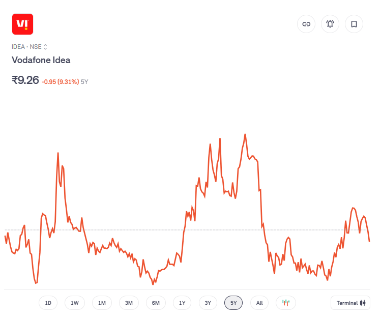 टेलीकॉम सेक्टर की कंपनी वोडाफोन आइडिया (VI) के शेयरों में पिछले पांच वर्षों में भारी बिकवाली देखने को मिली है. शुक्रवार को भी इसके शेयर में करीब 2 फीसदी की गिरावट दर्ज की गई, जिसके बाद यह लगभग 9.37 रुपये के आसपास कारोबार कर रहा है. पिछले पांच साल में इसके शेयर 9 फीसदी से अधिक टूट चुके हैं. यानी इस अवधि में निवेशकों को केवल नुकसान ही झेलना पड़ा है.