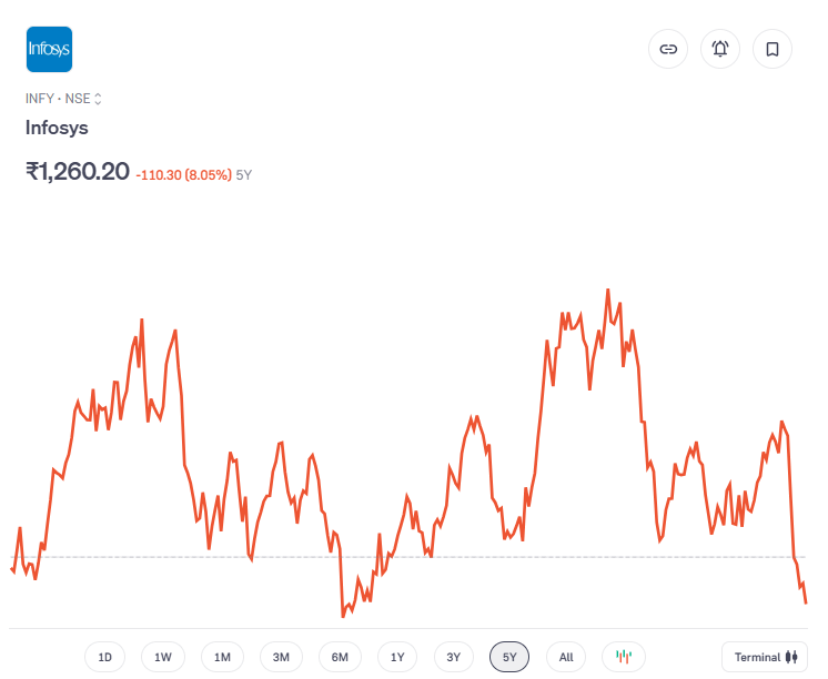 आईटी सेक्टर की दिग्गज कंपनी इन्फोसिस के शेयरों में भी हाल के समय में भारी बिकवाली हुई है. मौजूदा समय में आर्टिफिशियल इंटेलिजेंस (AI) के बढ़ते प्रभाव से आईटी सेक्टर के सामने नई चुनौतियां खड़ी हो गई हैं. पिछले तीन महीनों में इसके शेयर 20 फीसदी से अधिक टूट चुके हैं. शुक्रवार को भी इसमें 3 फीसदी से अधिक की गिरावट दर्ज की गई, जिसके बाद शेयर लगभग 1261 रुपये के आसपास कारोबार कर रहा है. पिछले पांच वर्षों में इसके शेयरों में 8 फीसदी से अधिक की गिरावट आई है.