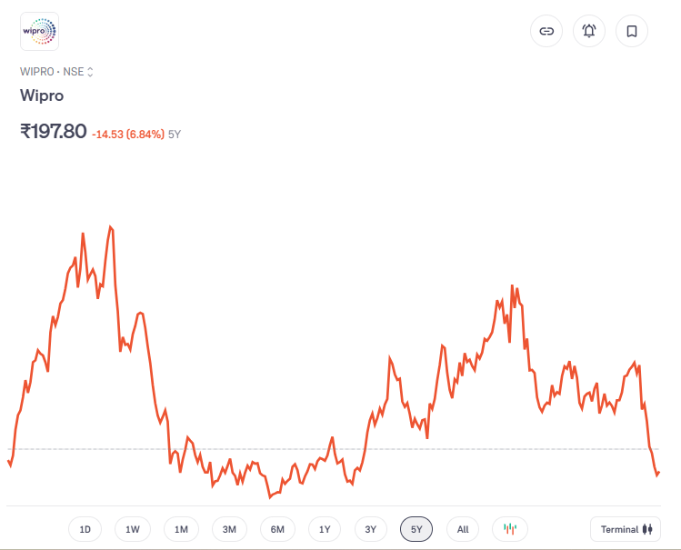 आईटी सेक्टर की एक और प्रमुख कंपनी विप्रो भी हालिया दिनों में AI के प्रभाव से दबाव में रही है. पिछले तीन महीनों में इसके शेयर 23 फीसदी से अधिक टूट चुके हैं. शुक्रवार को विप्रो का शेयर गैपडाउन के साथ खुला और 1.7 फीसदी से अधिक गिरकर लगभग 199 रुपये के आसपास कारोबार करता दिखा. पिछले पांच वर्षों में इसके शेयर ने निवेशकों को करीब -6.84 फीसदी का रिटर्न दिया है, यानी निवेशकों को नुकसान ही हुआ है.