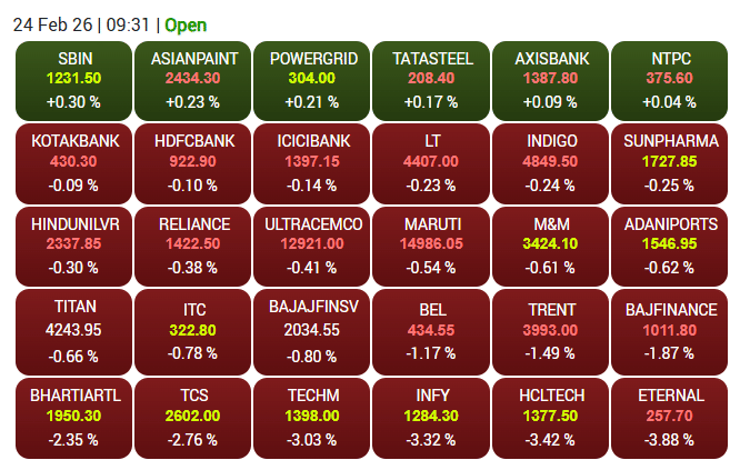 24 फरवरी को भारतीय शेयर बाजार गिरावट के साथ खुला. सेंसेक्स 700 अंक और निफ्टी करीब 200 अंक टूट गया. कमजोर वैश्विक संकेतों के बीच आईटी शेयरों में भारी बिकवाली दिखी. इंफोसिस, टीसीएस, एचसीएल टेक जैसे स्टॉक्स दबाव में रहे, जबकि ओएनजीसी, एलएंडटी और एक्सिस बैंक जैसे कुछ शेयरों में हल्की खरीदारी दिखी.