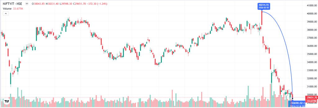 - निफ्टी आईटी इंडेक्स में 2008 के बाद की सबसे बड़ी गिरावट दर्ज की गई है, जिससे निवेशकों की 6 लाख करोड़ रुपये से अधिक की मार्केट वैल्यू साफ हो गई.