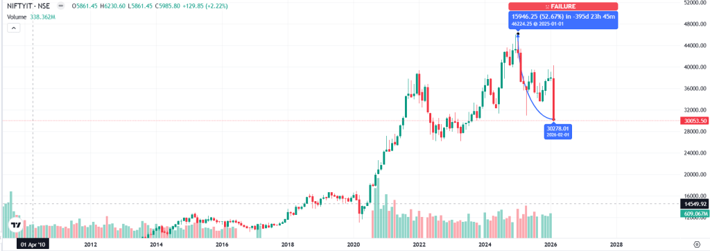 फरवरी में आईटी सेक्टर के शेयरों में भारी बिकवाली देखने को मिली है. Nifty IT इंडेक्स इस महीने अब तक 21.41 प्रतिशत टूट चुका है, जो 2008 के ग्लोबल फाइनेंशियल क्राइसिस के बाद सबसे खराब मंथली गिरावट मानी जा रही है. भारी भरकम शेयर जैसे Infosys, HCLTech और TCS में तेज गिरावट ने पूरे इंडेक्स को नीचे खींच लिया है. वैल्यूएशन कई साल के निचले स्तर पर पहुंच गया है. 1 जनवरी को निफ्टी आईटी 46200 के करीब था, अब 30,278 पर आ गया है. यानी करीब 16000 अंक निफ्टी आईटी फिसल चुका है.