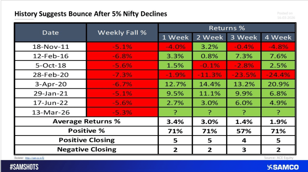 हाल ही में 13 मार्च 2026 को खत्म हुए हफ्ते में Nifty 50 करीब 5.3 प्रतिशत गिरा था. यह स्थिति इतिहास में पहले भी देखे गए पैटर्न जैसी है. ऐसे में टेक्निकली निचले स्तरों से बाजार में रिबाउंड की संभावना बढ़ जाती है. इसलिए फिलहाल निफ्टी में आक्रामक शॉर्ट पोजीशन लेने से बचना ज्यादा समझदारी भरा कदम हो सकता है.