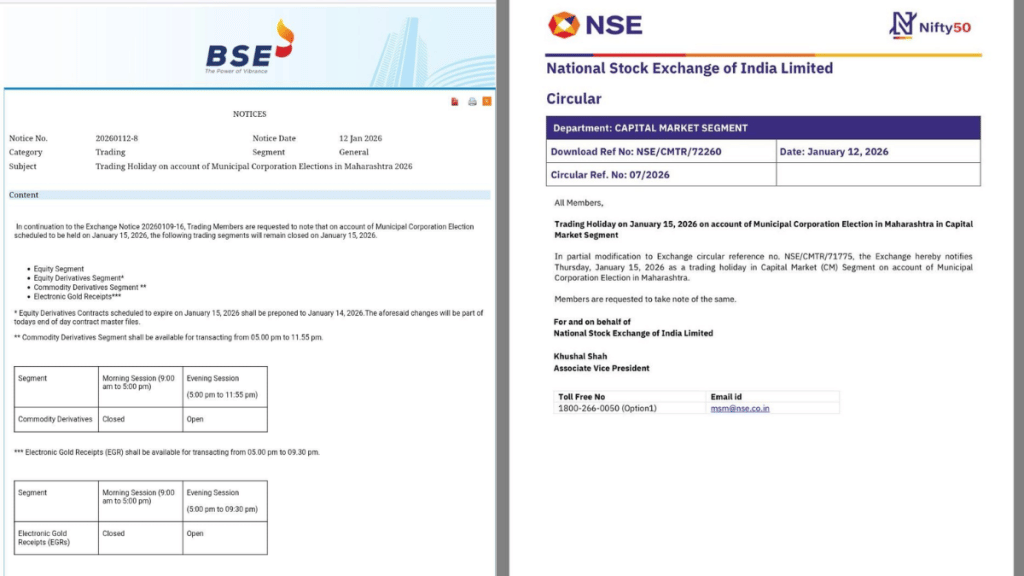नेशनल स्टॉक एक्सचेंज (NSE) और बॉम्बे स्टॉक एक्सचेंज (BSE) गुरुवार, 15 जनवरी 2026 को नगर निगम चुनाव के चलते बंद रहेंगे. इस दिन इक्विटी, डेरिवेटिव्स और अन्य प्रमुख बाजार सेगमेंट्स में कोई ट्रेडिंग नहीं होगी. सरकारी और अर्द्ध-सरकारी कार्यालय, PSU और बैंक भी बंद रहेंगे. निवेशकों को अपनी ट्रेडिंग योजनाओं में इस हॉलिडे का ध्यान रखना जरूरी है.