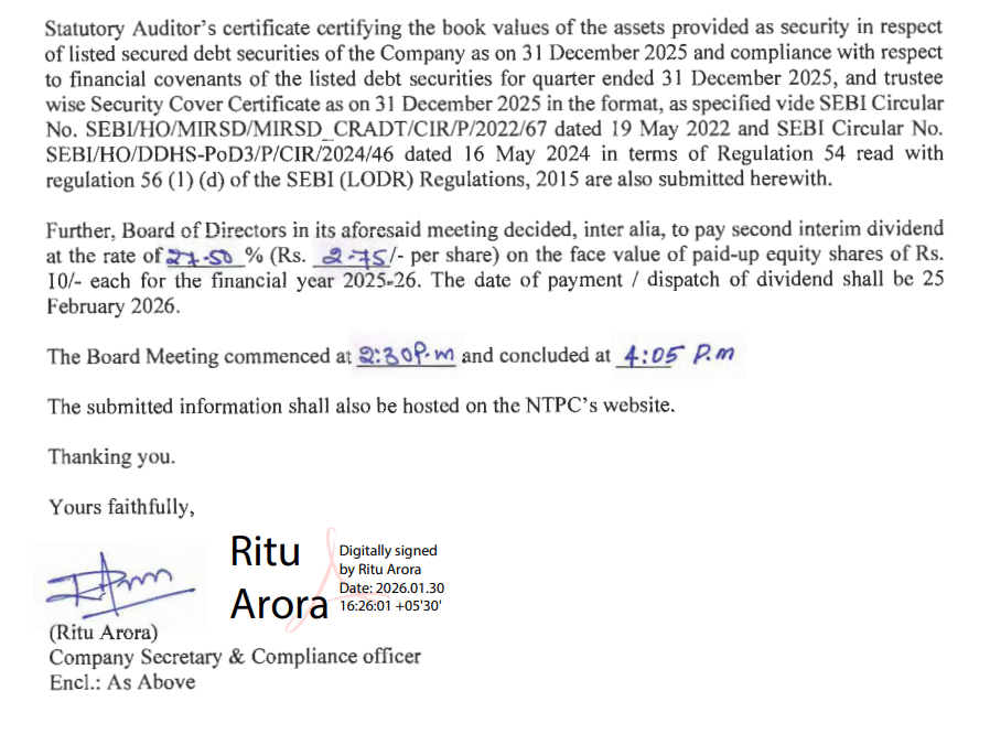 NTPC के बोर्ड ने शेयरधारकों को 2.75 रुपये प्रति शेयर (यानी 27.50 फीसदी) का दूसरा अंतरिम डिविडेंड देने का फैसला किया है. यह डिविडेंड 10 रुपये फेस वैल्यू वाले इक्विटी शेयर पर दिया जाएगा. कंपनी के मुताबिक, डिविडेंड का भुगतान 25 फरवरी 2026 को किया जाएगा या उसी दिन से भेजने की प्रक्रिया शुरू होगी.