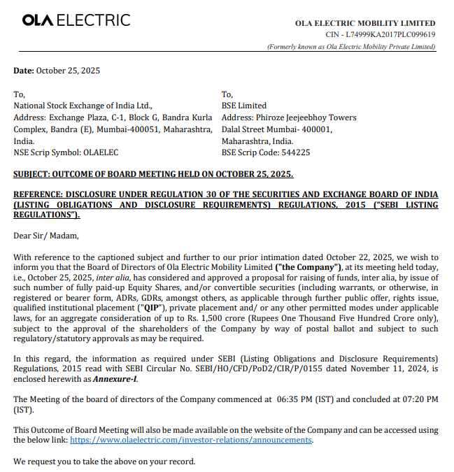 Ola Electric Fundraising Board Nod: इलेक्ट्रिक टू-व्हीलर निर्माता Ola Electric ने शनिवार, 25 अक्टूबर को घोषणा की कि कंपनी के बोर्ड ने 1,500 करोड़ रुपये तक की फंड रेजिंग को मंजूरी दे दी है. कंपनी यह पूंजी अलग-अलग माध्यमों से जुटाएगी ताकि अपने भविष्य के विस्तार और कारोबारी जरूरतों को पूरा किया जा सके. कंपनी ने इसकी जानकारी फाइलिंग के जरिये दी है. कंपनी के इस फैसले का असर सोमवार, 27 अक्टूबर को बाजार खुलने के बाद शेयरों पर देखने को मिल सकता है.