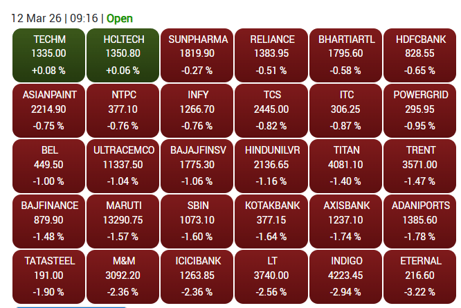घरेलू शेयर बाजार गुरुवार (12 मार्च) को गिरावट के साथ खुला. सेंसेक्स 494 अंक और निफ्टी 192 अंक नीचे खुला. शुरुआती कारोबार में सेंसेक्स 915 अंक और निफ्टी 264 अंक तक गिर गया. ज्यादातर सेक्टरों के शेयर दबाव में रहे, जबकि टेक महिंद्रा और एचसीएल टेक में हल्की बढ़त देखने को मिली.