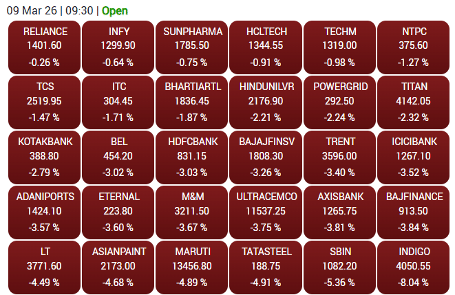 अमेरिका-इजरायल और ईरान में जारी युद्ध को लेकर क्रूड ऑयल की कीमतों में तेजी और ग्लोबल मार्केट में बिकवाली के बीच सोमवार यानी 9 मार्च को भारतीय शेयर बाजार गिरावट के साथ खुला. बीएसई सेंसेक्स शुक्रवार को 78,918.90 पर बंद हुआ था, जबकि सोमवार को यह 77,056.75 पर खुला. इस तरह सेंसेक्स करीब 1,862.15 अंक की गिरावट के साथ गैप-डाउन खुला. वहीं निफ्टी 50 भी करीब 582.40 अंक गिरकर खुला 23,868.05 पर खुला. शुक्रवार को निफ्टी 24,450.45 पर बंद हुआ था.