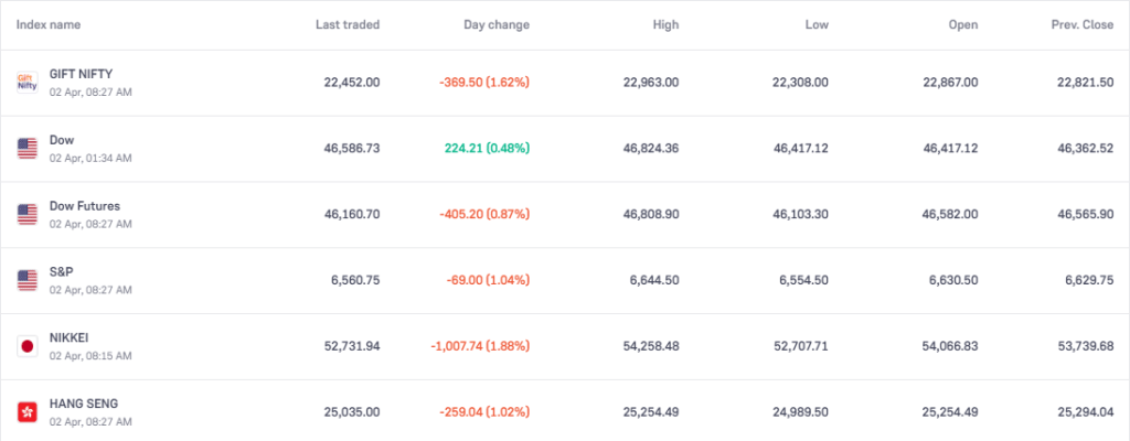 ट्रंप का देश के नाम संबोधन के बाद वैश्विक शेयर बाजारों में आज मिला-जुला रुख देखने को मिला. Gift Nifty में 1.62% की गिरावट के साथ यह 22,452 पर कारोबार करता दिखा. एशियाई बाजारों में निक्केई में 1.88% और हैंग सेंग में 1.02% की गिरावट दर्ज की गई, जिससे निवेशकों की सतर्कता साफ नजर आई. वहीं अमेरिकी बाजार में मामूली तेजी देखने को मिली है.