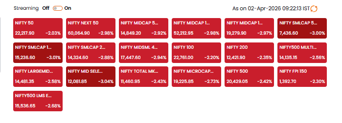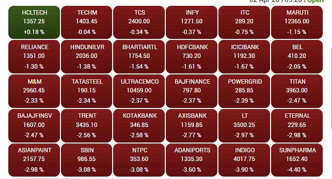 एक दिन पहले आई जोरदार तेजी के बाद 2 अप्रैल को शेयर बाजार की शुरुआत कमजोर रही. वैश्विक संकेतों और मुनाफावसूली के दबाव में सेंसेक्स और निफ्टी दोनों गिरावट के साथ खुले. शुरुआती कारोबार में ही बाजार में बड़ी गिरावट देखने को मिली, जिससे निवेशकों की सतर्कता बढ़ गई और बाजार का रुख नकारात्मक नजर आया.