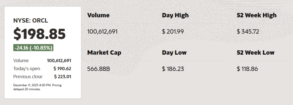 ऑरेकल ने अपनी ताजा तिमाही नतीजों में बताया कि कंपनी AI डेटा सेंटर बनाने पर जबरदस्त निवेश कर रही है. पिछले क्वार्टर में ही कंपनी ने 12 अरब डॉलर खर्च किए. निवेशकों को डर है कि कमाई की रफ्तार के मुकाबले खर्च बहुत तेजी से बढ़ रहा है. इसी चिंता ने गुरुवार को बिकवाली का दौर शुरू कर दिया और शेयर 11% तक धड़ाम से गिर गया.
