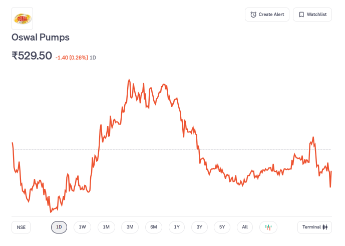सोलर एनर्जी से जुड़े पंप और मोटर कारोबार में एक्टिव Oswal Pumps Limited मजबूत ऑर्डर बुक और लगभग कर्ज-मुक्त स्थिति के बावजूद अपने 52-सप्ताह के उच्च स्तर से भारी गिरावट पर ट्रेड कर रहा है. एक साल पहले की तुलना में अब शेयर लगभग 359 रुपये सस्ता मिल रहा है.