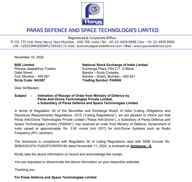 ऐसे में यह प्रोजेक्ट Paras Defence को भारत के क्रिटिकल काउंटर-ड्रोन डेवलपमेंट प्रोग्राम का अहम हिस्सा बना देता है. इससे इतर, कंपनी ने सोमवार, 10 नवंबर को भी फाइलिंग के जरिये बताया था कि उसे मिनिस्ट्री ऑफ डिफेंस से 3.95 करोड़ रुपये का काम मिला है. इसमें कंपनी रेडियो फ्रीक्वेंसी जैसे जैमर बनाएगी.