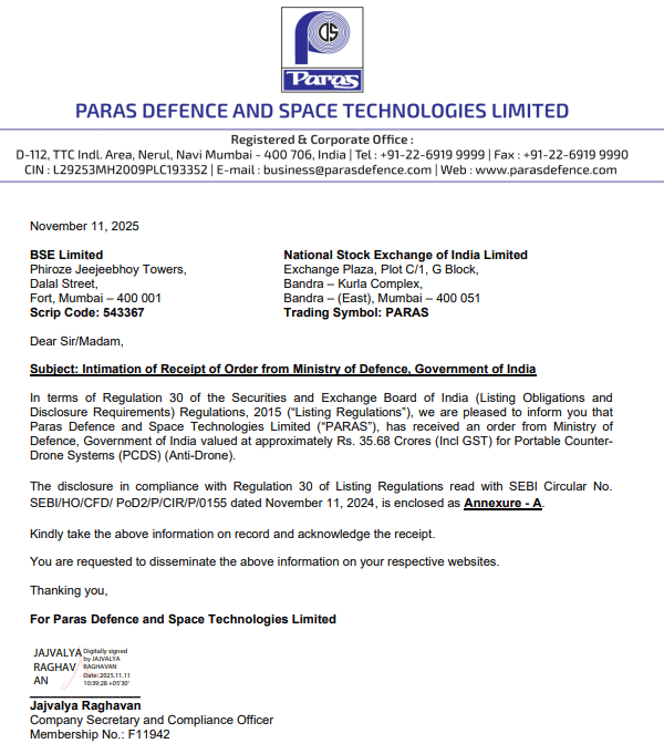 Paras Defence and Space Tech Ltd Bags Order: डिफेंस सेक्टर की प्रमुख कंपनी Paras Defence and Space Technologies Limited के शेयर मंगलवार, 11 नवंबर को 1.92 फीसदी की बढ़त के साथ बंद हुए. कंपनी के शेयरों में यह तेजी तब देखने को मिली जब उसने मिन्स्ट्री ऑफ डिफेंस से 35.68 करोड़ रुपये का एक नया ऑर्डर हासिल करने की घोषणा की. इस ऑर्डर में कंपनी को Portable Counter Drone System (PCDS) की सप्लाई करनी है जो भारत की रक्षा तैयारी को आधुनिक तकनीक से और मजबूत करेगा. दिलचस्प बात यह है कि कंपनी को यह दो दिनों में दूसरा बड़ा डिफेंस ऑर्डर मिला है, जिससे निवेशकों में उत्साह साफ झलक रहा है.