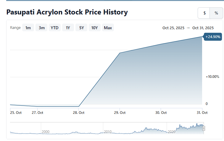 Pasupati Acrylon share price: शेयर बाजार में गुरुवार के ट्रेडिंग सेशन में Pasupati Acrylon लिमिटेड के शेयर में जबरदस्त तेजी देखने को मिली. कंपनी के शेयर बीएसई पर करीब 13.4 प्रतिशत तक उछले. ऐसा इसलिए हुआ क्योंकि कंपनी को तेल मार्केटिंग कंपनियों से एथनॉल सप्लाई का लगभग 215 करोड़ रुपये का ऑर्डर मिला है.