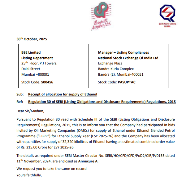 स्टॉक एक्सचेंज को दी गई जानकारी के अनुसार, पशुपति एक्रिलॉन लिमिटेड को एथनॉल ब्लेंडेड पेट्रोल प्रोग्राम (EBPP) के तहत इथेनॉल सप्लाई ईयर 2025-26 के लिए 32,320 किलोलीटर एथनॉल की सप्लाई का अलॉटमेंट मिला है. इस ऑर्डर की कुल अनुमानित वैल्यू करीब 215 करोड़ रुपये है.