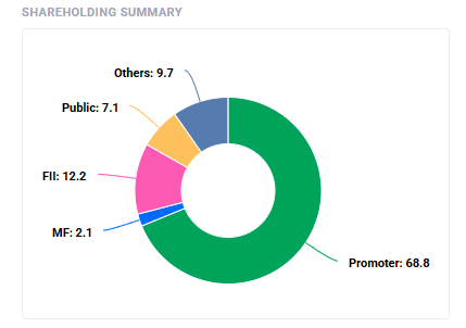 प्रमोटर्स के पास 68.8 फीसदी हिस्सा है. FII 12.2 फीसदी हिस्सेदारी रखते हैं. आम पब्लिक के पास 7 फीसदी तो वहीं MF के पास 2.1 फीसदी हिस्सेदारी है.