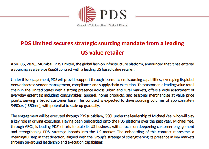 कंपनी को हाल ही में एक बड़े अमेरिकी रिटेलर से ‘Sourcing as a Service’ कॉन्ट्रैक्ट मिला है, जिसने बाजार का ध्यान खींचा है. इस डील के तहत PDS एंड-टू-एंड सोर्सिंग सॉल्यूशन प्रदान करेगी, जिसमें वेंडर मैनेजमेंट, कंप्लायंस और सप्लाई चेन ऑपरेशंस शामिल हैं. शुरुआती तौर पर इस प्रोजेक्ट से करीब 450 करोड़ रुपये (लगभग 50 मिलियन डॉलर) का बिजनेस मिलने का अनुमान है, जिसे आगे चरणबद्ध तरीके से बढ़ाया जा सकता है.