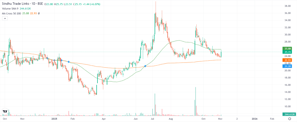 Sindhu Trade Links: मंगलवार को सिंधु ट्रेड लिंक्स लिमिटेड (Sindhu Trade Links Ltd) के शेयर में जबरदस्त तेजी देखने को मिली. शेयर दिन के निचले स्तर से 9.5 प्रतिशत चढ़कर 25.75 रुपये प्रति शेयर पर पहुंच गया. विदेशी संस्थागत निवेशकों (FIIs) की ताजा खरीदारी और आने वाली बोर्ड मीटिंग की खबर से शेयर में भारी वॉल्यूम देखने को मिला. अभी यह शेयर अपने एक साल के हाई से 36 फीसदी नीचे कामकाज कर रहा है.
