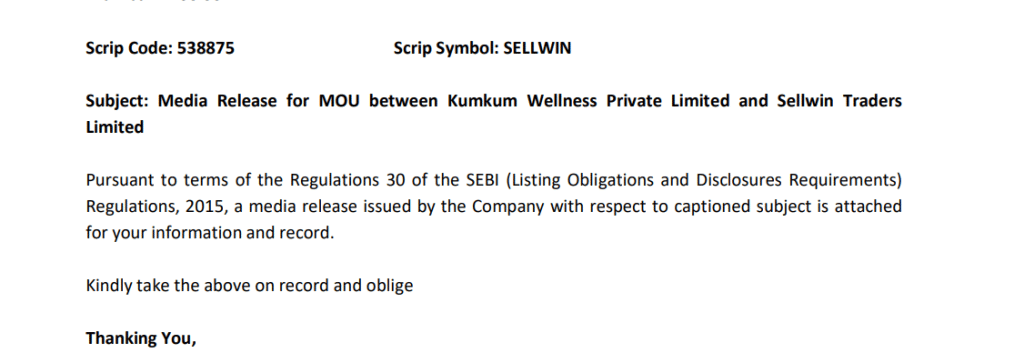 14 नवम्बर से स्टॉक में तेजी तब शुरू हुई जब कंपनी ने Kumkum Wellness Private Limited के साथ एक MoU साइन किया. Kumkum Wellness की ब्रांड “KAYAPALAT” काफी चर्चित है. इस समझौते के तहत Sellwin Traders पहले चरण में KWPL में 36 प्रतिशत हिस्सेदारी खरीदेगी और अगले 18 महीनों में हिस्सेदारी को 60 प्रतिशत तक बढ़ाने का विकल्प रखेगी. डिफिनिटिव एग्रीमेंट 31 दिसम्बर 2025 तक पूरे होंगे, जो ड्यू डिलिजेंस और अन्य मंजूरियों पर निर्भर करेंगे.