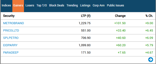 शुक्रवार को Pre-Open Market में BSE पर इन पांच स्टॉक्स का बोलबाला रहा है. इसमें Metro Brands के शेयरों में 101 अंक की तेजी आई. इस तेजी के बाद इसके दाम 1229 रुपये पर पहुंच गया. Pricol Ltd के शेयर में 33 अंक की तेजी आई. Supreme Petrochem के शेयर में भी 40 अंक से अधिक की तेजी आई है.