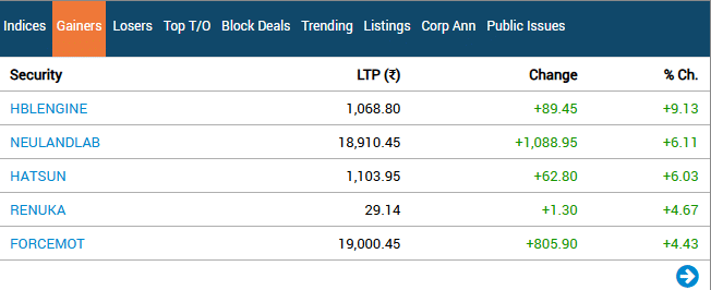 HBL Engineering Ltd के शेयर में 9 फीसदी से अधिक की तेजी देखी गई है. Neuland Laboratories Ltd के शेयरों में भी 6 फीसदी से अधिक की तेजी है. सरकार की ओर से 15 टन चीनी निर्यात की अनुमति मिलने के बाद Shree Renuka Sugars Ltd के शेयर में तेजी देखी गई है.